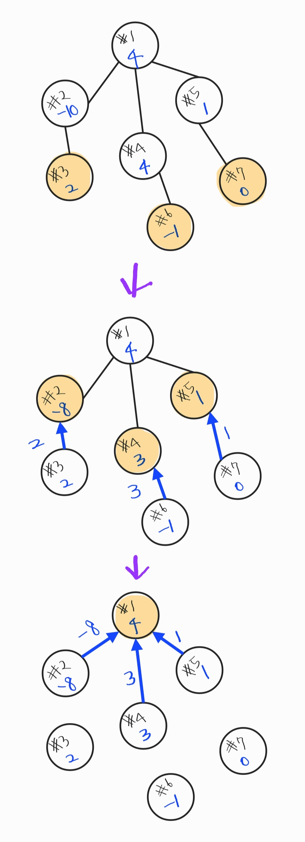 각 점에 가중치가 부여된 트리가 주어집니다. 당신은 다음 연산을 통하여, 이 트리의 모든 점들의 가중치를 0으로 만들고자 합니다. 임의의 연결된 두 점을 골라서 한쪽은 1 증가시키고, 다른 한