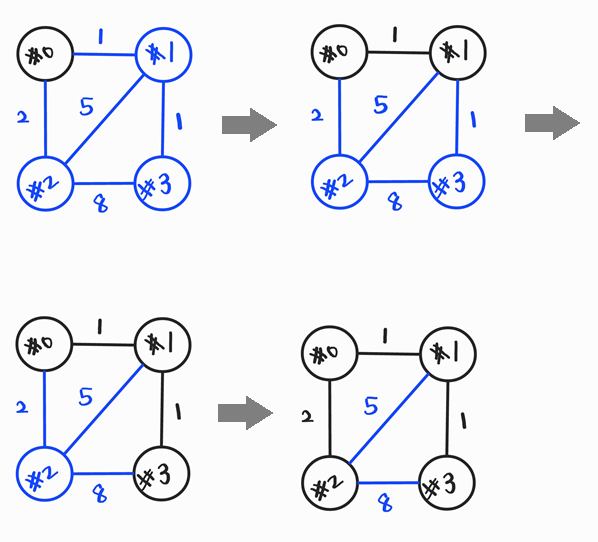 - graph = {0: [(1, 1), (2, 2)], 1: [(1, 0), (5, 2), (1, 3)], 2: [(2, 0), (5, 1), (8, 3)], 3: [(1, 1), (8, 2)]}