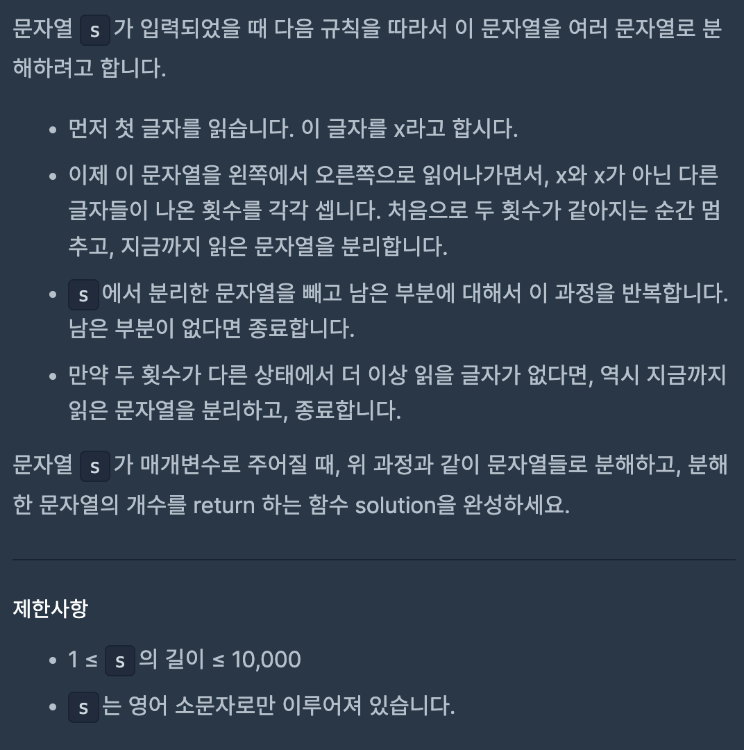(1) "x와 x가 아닌 다른 글자들이 나온 횟수를 각각 셉니다."의 해석