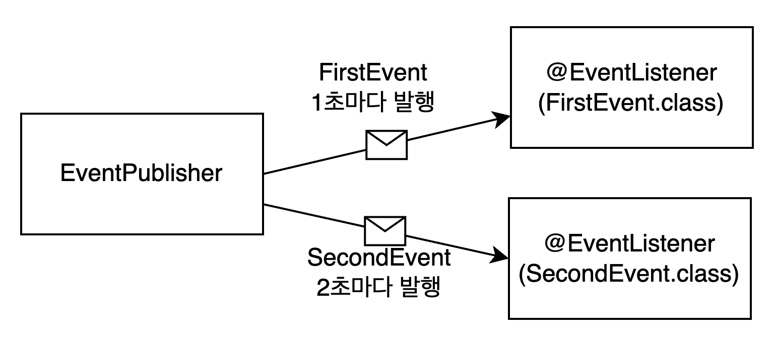 정기적으로 이벤트를 발행하기 위해 EventScheduler 클래스를 구현했습니다. 스케줄링을 통해 각각 1초와 2초마다 이벤트를 발행합니다.