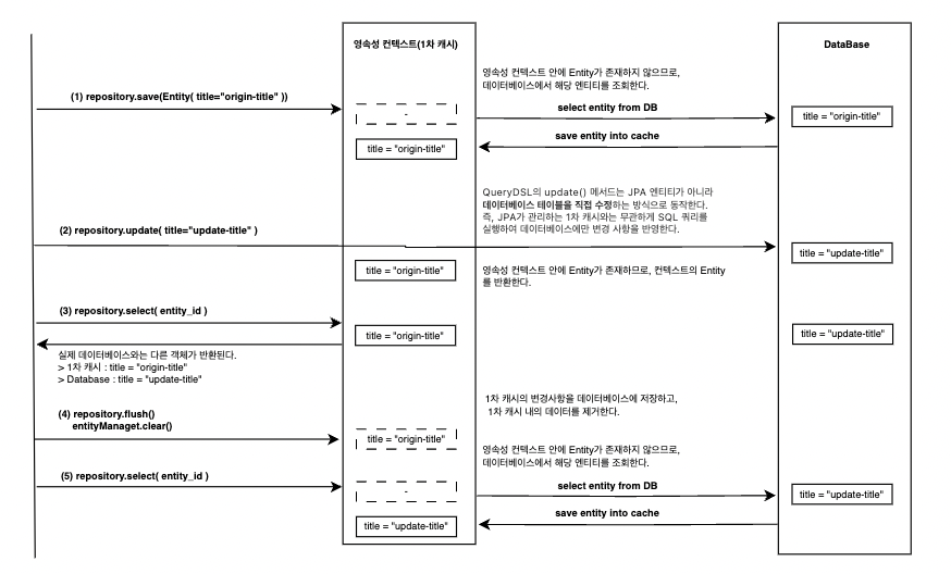 하지만 QueryDSL의 update() 메서드는 JPA 엔티티가 아니라 데이터베이스 테이블을 직접 수정하는 방식으로 동작합니다. 즉, JPA가 관리하는 1차 캐시와는 무관하게 SQL 쿼리를 실행하여 데이터베이스에만 변경 사항을 반영합니다. 이렇게 하면 대량 데이터를 효율적으로 수정할 수 있지만, JPA는 이 변경 사항을 알지 못하므로 1차 캐시에 있는 엔티티는 여전히 이전 상태를 유지하게 됩니다.