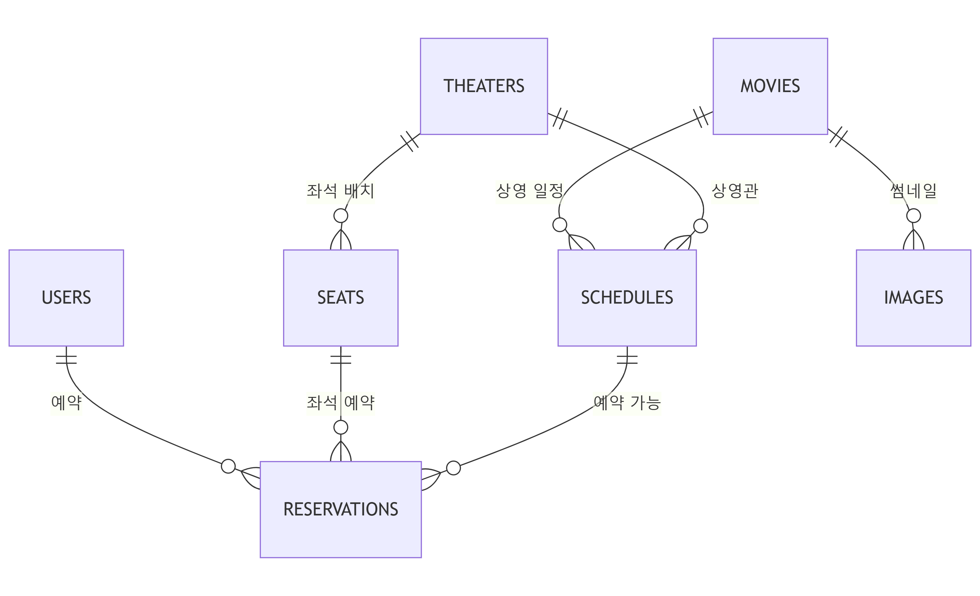 따라서 MOVIES와 SCHEDULES를 분리하고, 상영 회차별 좌석 예약도 이 SCHEDULES를 기준으로 연결했다.