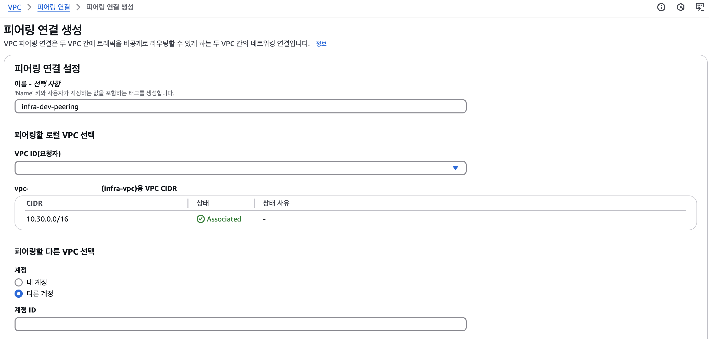 먼저 Infra 계정에서 VPC Peering Connection을 생성했다. 이때 중요한 것은 Peer AWS Account ID와 Peer VPC ID를 정확하게 입력하는 것이었다. Requester는 Infra VPC가 되었고, Accepter는 Dev VPC가 된다. 여기서 Accepter가 따로 수락을 해야 Peering이 활성화될 수 있다는 점을 주의해야 한다.