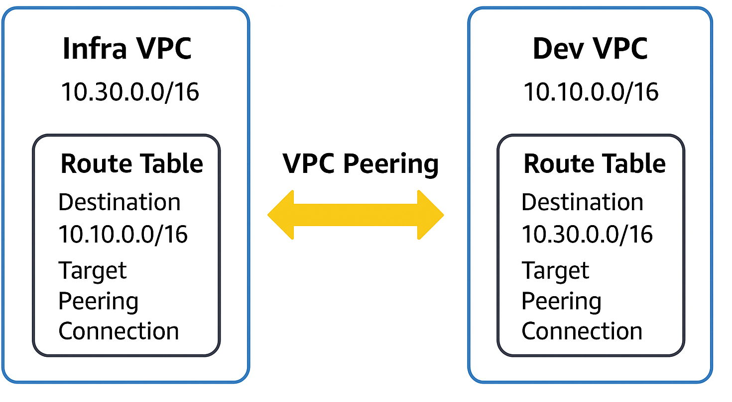 - Infra VPC Route Table: Destination = 10.10.0.0/16 → Target = Peering Connection